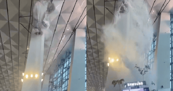 Trần nhà ga T3 sân bay ở Jakarta đổ sập giữa trời mưa, nước xối như thác đổ khiến hành khách hoảng loạn