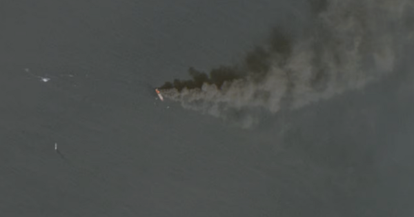 Hình ảnh vệ tinh chụp ngày 18/3 cho thấy những cột khói lớn bốc lên từ tàu container Safeen Prestige mang cờ Malta khi nó đang trôi dạt trên eo biển Hormuz.